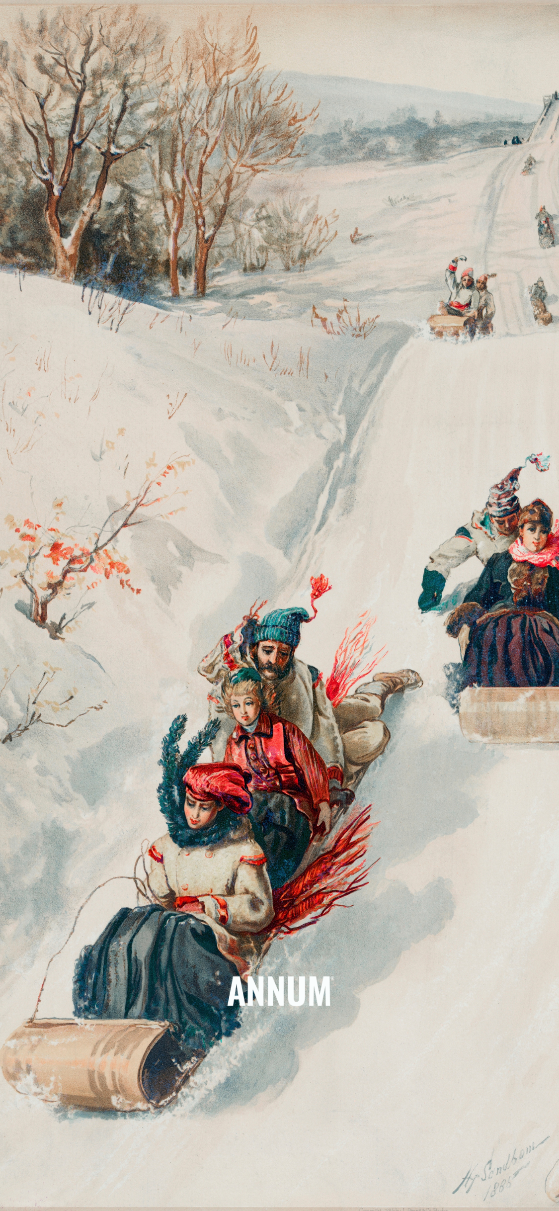 “Tobogganing” chromolithograph (1886) by L. Prang & Co. Original from Library of Congress. Public domain.