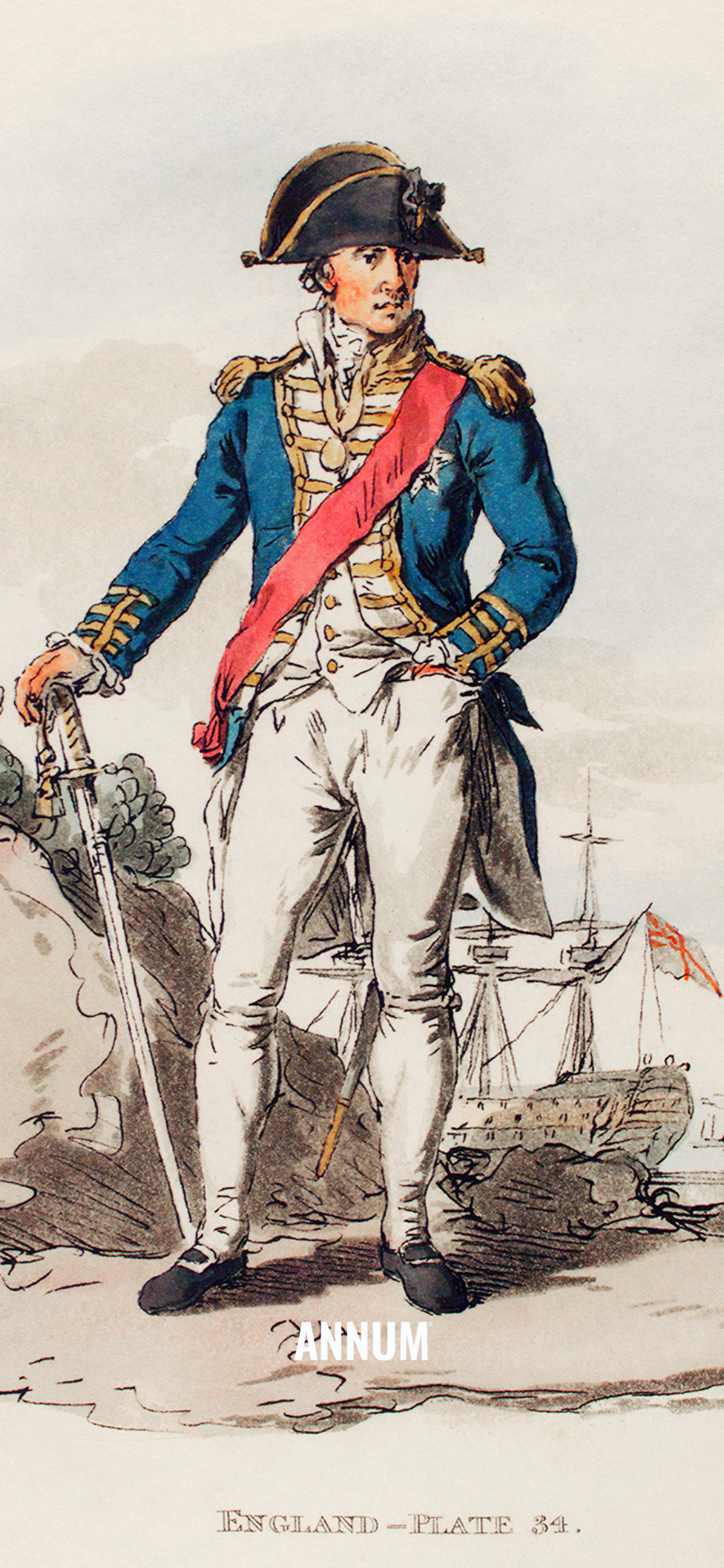 Illustration of an admiral from Picturesque Representations of the Dress and Manners of the English(1814) by William Alexander. Original from The New York Public Library. Public domain.
