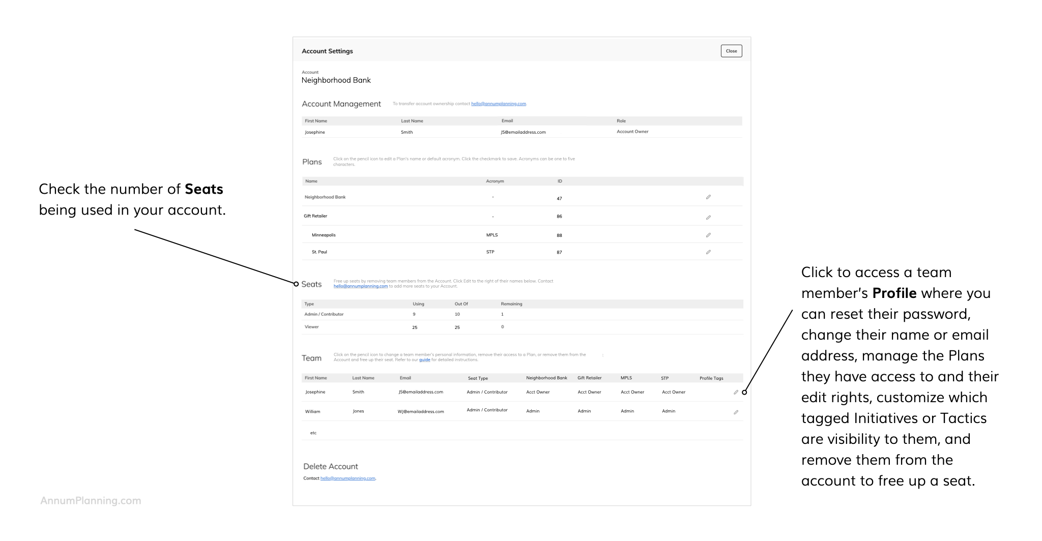 For information on account management, changing the name of a plan, upgrading your plan, checking active seat counts, and increasing or decreasing seat counts, Account Owners should visit the Account Management section of our Account Owner Guide.