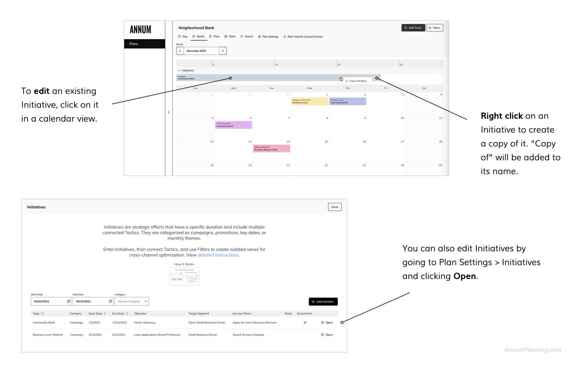 • If a Lead Initiative is deleted, all connected Nested Initiatives Variants will be deleted as well. Any Tactics that were linked will still remain in the calendar.