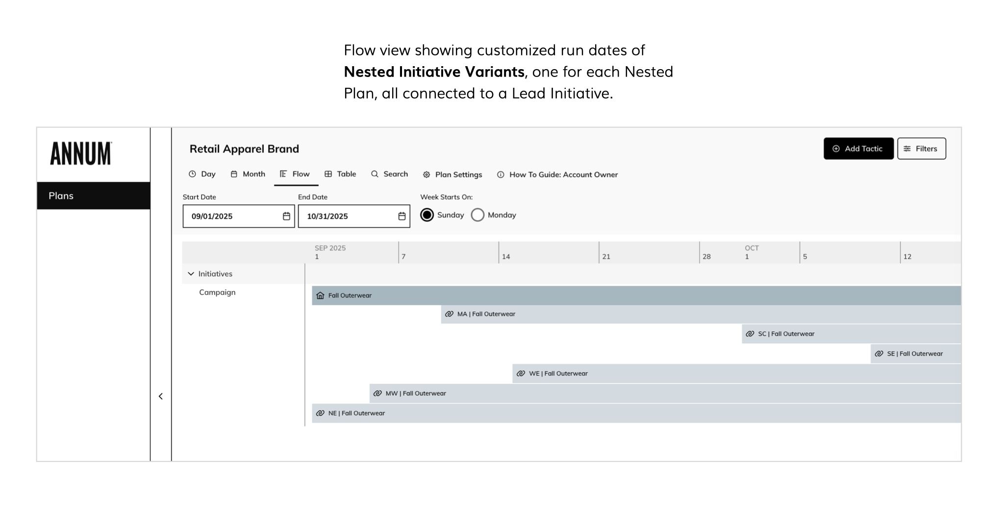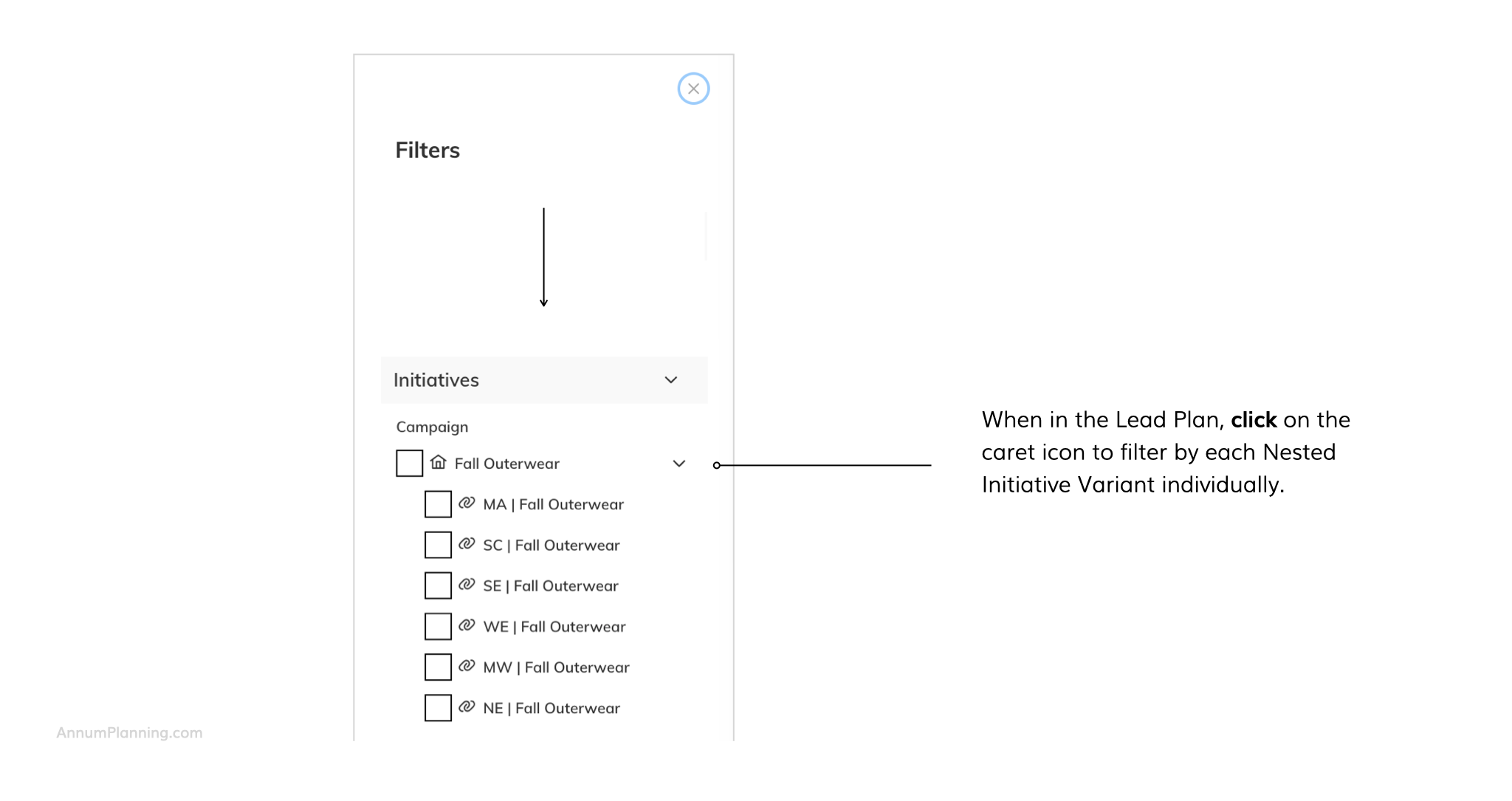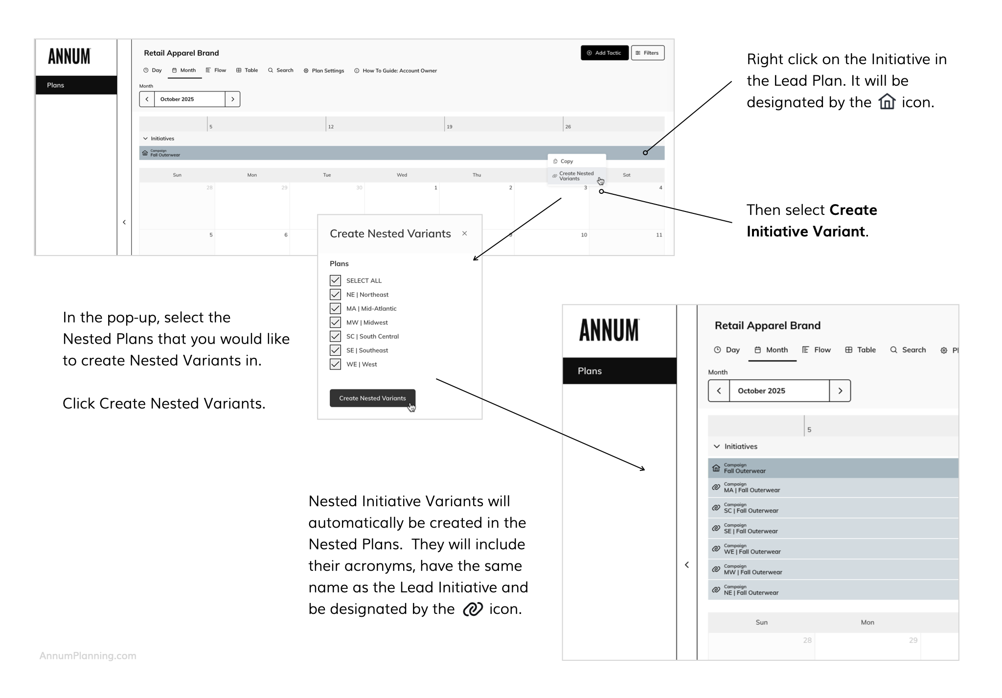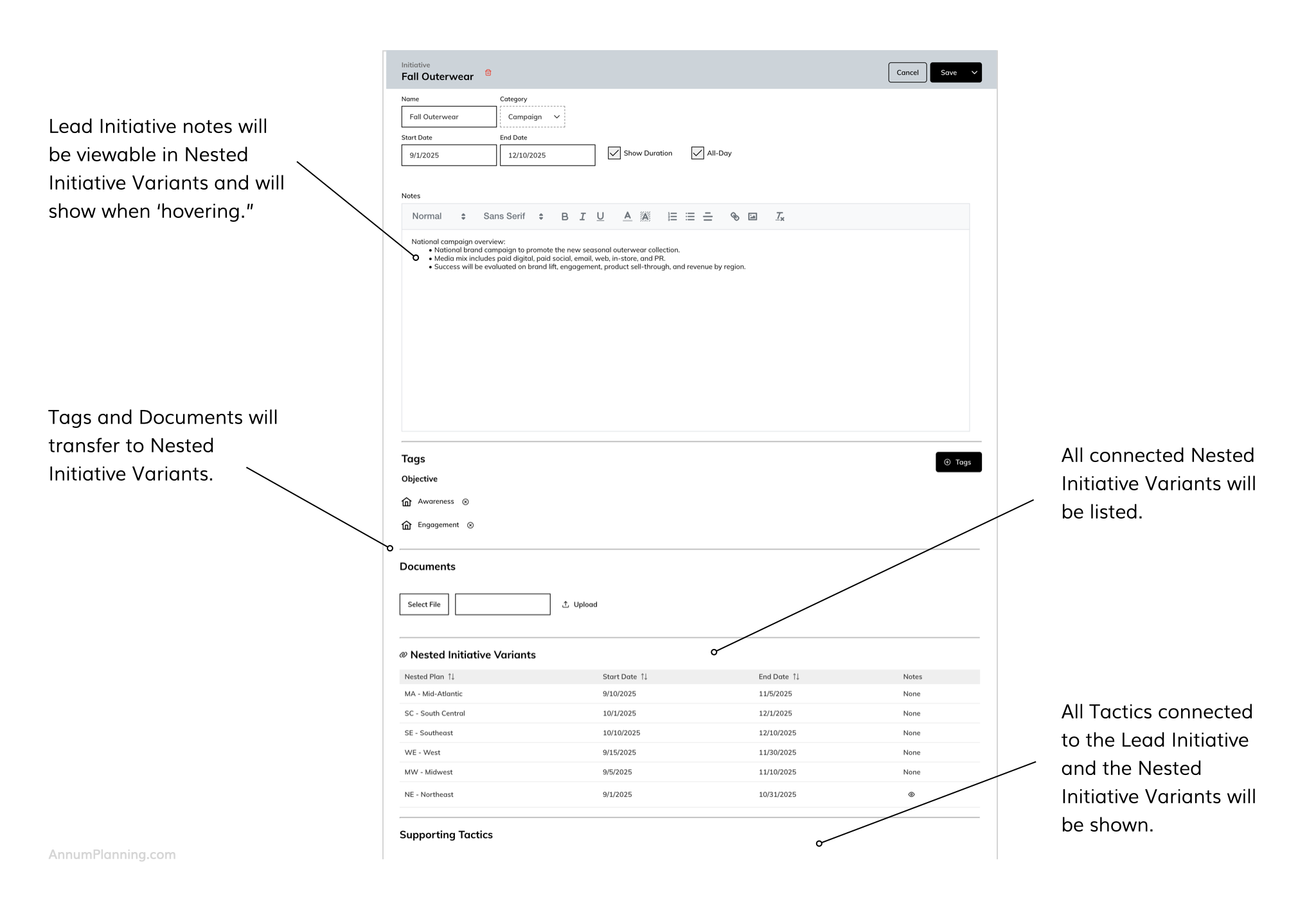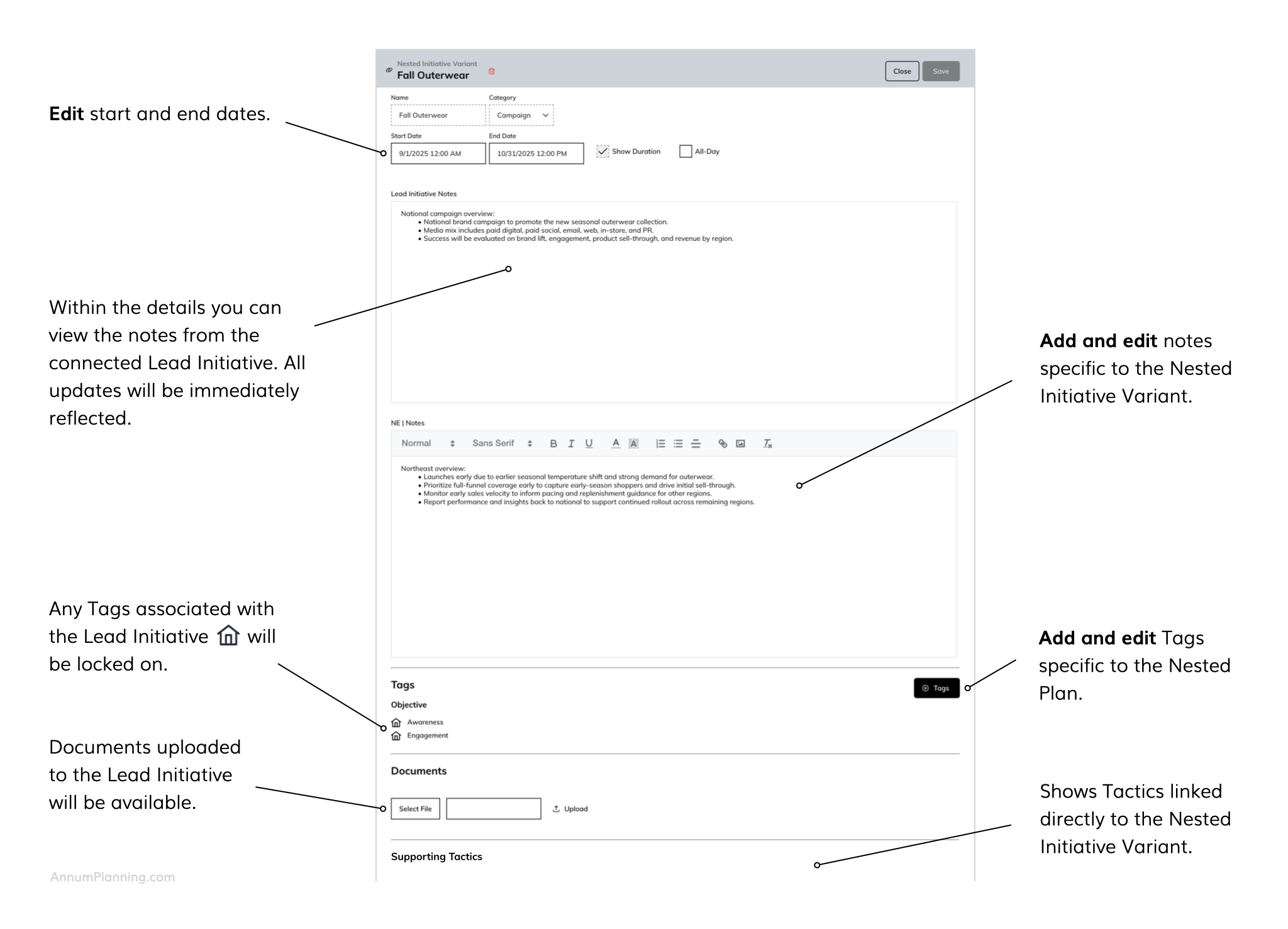 If you have a brand or national level Initiative within the Lead Plan that has differing run dates by Nested Plan (e.g. by business unit or region), you can create Nested Initiative Variants to show each Nested Plan's unique run dates while keeping everything connected to the Lead Initiative for ease of filtering.